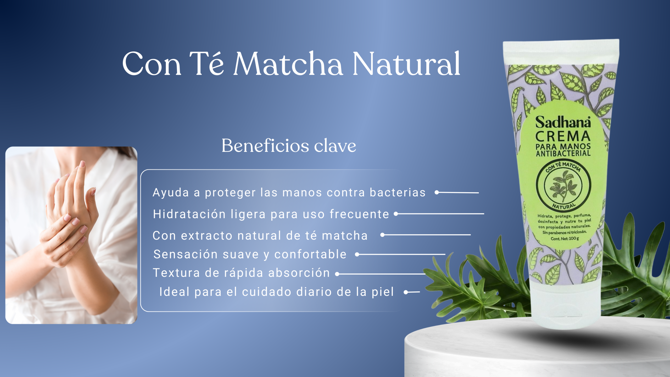 Diseñada para quienes buscan protección antibacterial con un enfoque natural, Sadhana Crema para Manos con Té Matcha hidrata y protege la piel mientras ayuda a mantener las manos limpias y cuidadas.